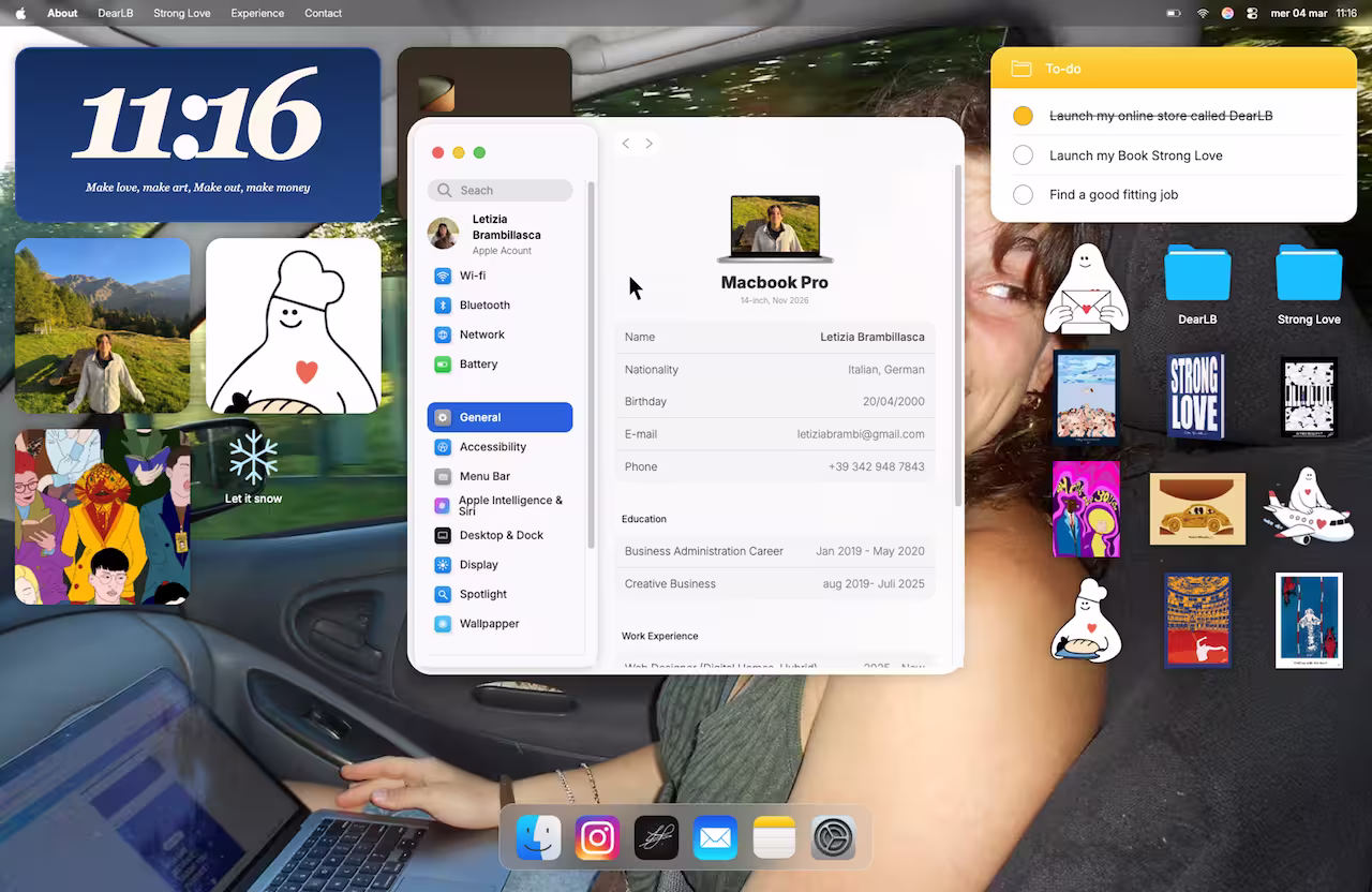 Most portfolio websites follow the same structure: a grid of projects, a simple about page, and a contact button. But Letizia’s work is expressive, personal, and playful. A traditional layout wouldn’t reflect that. Instead of designing another standard portfolio, the idea was to create an experience inspired by something everyone already understands: the desktop of a computer. Visitors land in an environment that feels like a workspace. Files, folders, widgets, and icons become the navigation system. Projects open like windows, making the portfolio feel interactive rather than static. The goal wasn’t just to show the work. It was to create a digital environment that reflects how creativity actually lives and moves.